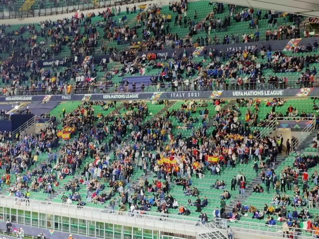 已经成为赢家的意大利,无需再带着一种复仇的执念面对西班牙。而在欧洲杯冠军加身之后,欧国联的锦标成了蛋糕上的樱桃:宴席已经铺开,即使樱桃被宾客摘走,也没有理由中断庆典。“是我们,是我们,欧洲冠军是我们!”——这样的歌声,在通往球场的地铁里循环播放,又在 比赛过程中响彻圣西罗的各个看台,即使是在球队早早比分落后、又少一人作战之际也未曾止歇。